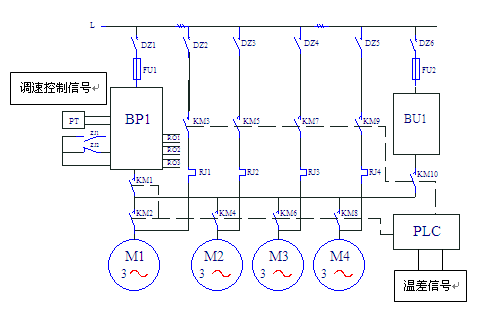 圖中,BP1—森蘭SB200-37T4變頻器,BU—軟啟動(dòng)器(自耦減壓起動(dòng)器),系統采用循環(huán)投切方式,溫差信號送入PLC,經(jīng)過(guò)PLC處理后,到變頻器作為調速控制信號。整個(gè)系統的運行信息由PLC送到計算機上。