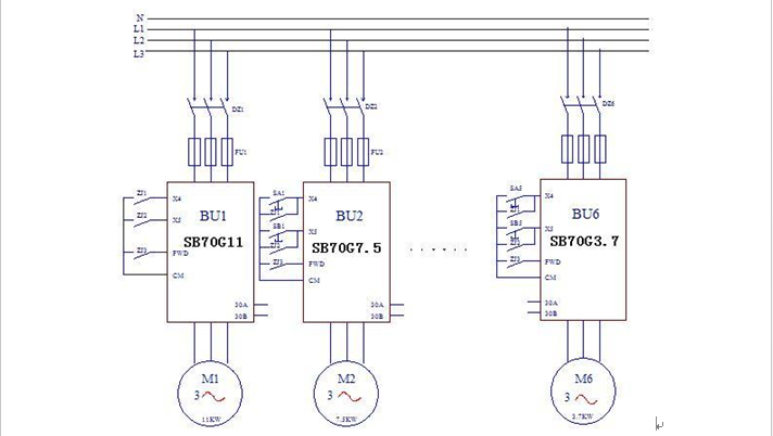 本例以分部傳動(dòng)點(diǎn)為6個(gè)點(diǎn)的1092為例加以說(shuō)明。圖2中,各傳動(dòng)點(diǎn)的電機功率分別為:網(wǎng)部11kW,壓榨7.5kW,烘1~烘2均為5.5kW,壓光3.7kW,卷紙3.7kW。紙機的負載為恒轉矩負載和大慣性負載,選用希望森蘭SB70G系列變頻器,速度的調節用變頻器的端子X(jué)4、X5用以設定頻率。在X4、X5端口上,接有按鈕和中間繼電器常開(kāi)節點(diǎn),按鈕SA1~SA5本級速度上升微調;SB1~SB5本級速度的下降微調;ZJ1總速度上升;ZJ2總速度下降;ZJ3總起/總停,這又是一種速度鏈的分配方式。