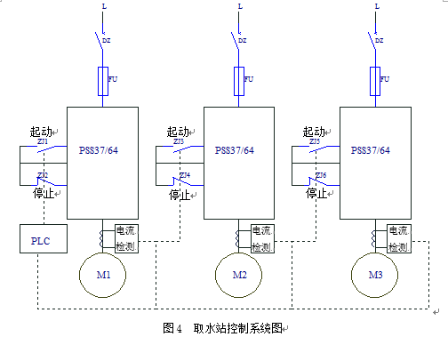 考慮到取水站無(wú)人值守,選擇啟動(dòng)設備時(shí)著(zhù)重可靠性,就選用軟啟動(dòng)器,每臺水泵配1臺,共3臺。沉淀池內設有“高”、“中”、“低”3個(gè)水位點(diǎn),用PLC根據沉淀池水位的高低來(lái)決定1臺水泵運行或2臺水泵運行,還可通過(guò)編程控制使3臺水泵使用的時(shí)間盡量相同。水泵的運行信號、故障信號通過(guò)電纜送到水處理站顯示。取水站的抽水水位比水泵安裝位置低2米,水泵初次起動(dòng)或停止后再起動(dòng),都可能形成“真空”而吸不上水,原來(lái)的方式是靠人工注水。無(wú)人值守后必須自動(dòng)地完成注水排氣這個(gè)過(guò)程,其方法是采用間接檢測方式,即檢測水泵電機的運行電流。如果管道有“真空”,則電機近似于空載運行,電流較??;如果管道沒(méi)有“真空”,則電機接近滿(mǎn)載運行,電流基本上為額定電流,二者的差值較大。用電流檢測來(lái)確定電機或抽水管道有無(wú)真空,如有問(wèn)題,PLC給出報警信號,通知值班人員處理。