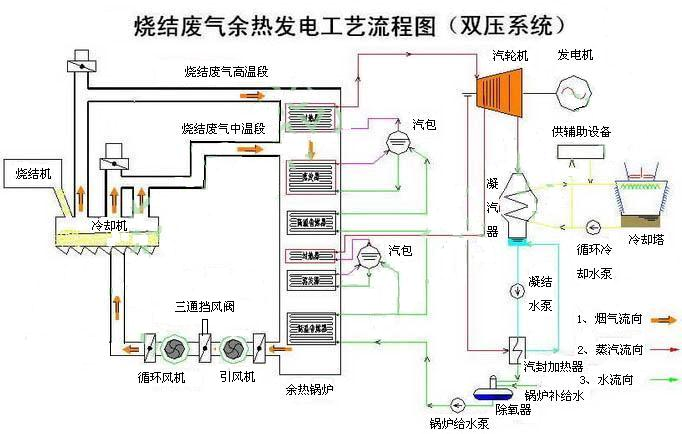 目前,國內燒結廢氣余熱回收利用主要有三種方式:一是直接將廢煙氣經(jīng)過(guò)凈化后作為點(diǎn)火爐的助燃空氣或用于預熱混合料,以降低燃料消耗,這種方式較為簡(jiǎn)單,但余熱利用量有限,一般不超過(guò)煙氣量的10%;二是將廢煙氣通過(guò)熱管裝置或余熱鍋爐產(chǎn)生蒸汽,并入全廠(chǎng)蒸汽管網(wǎng),替代部分燃煤鍋爐;三是將余熱鍋爐產(chǎn)生蒸汽用于驅動(dòng)汽輪機組發(fā)電。