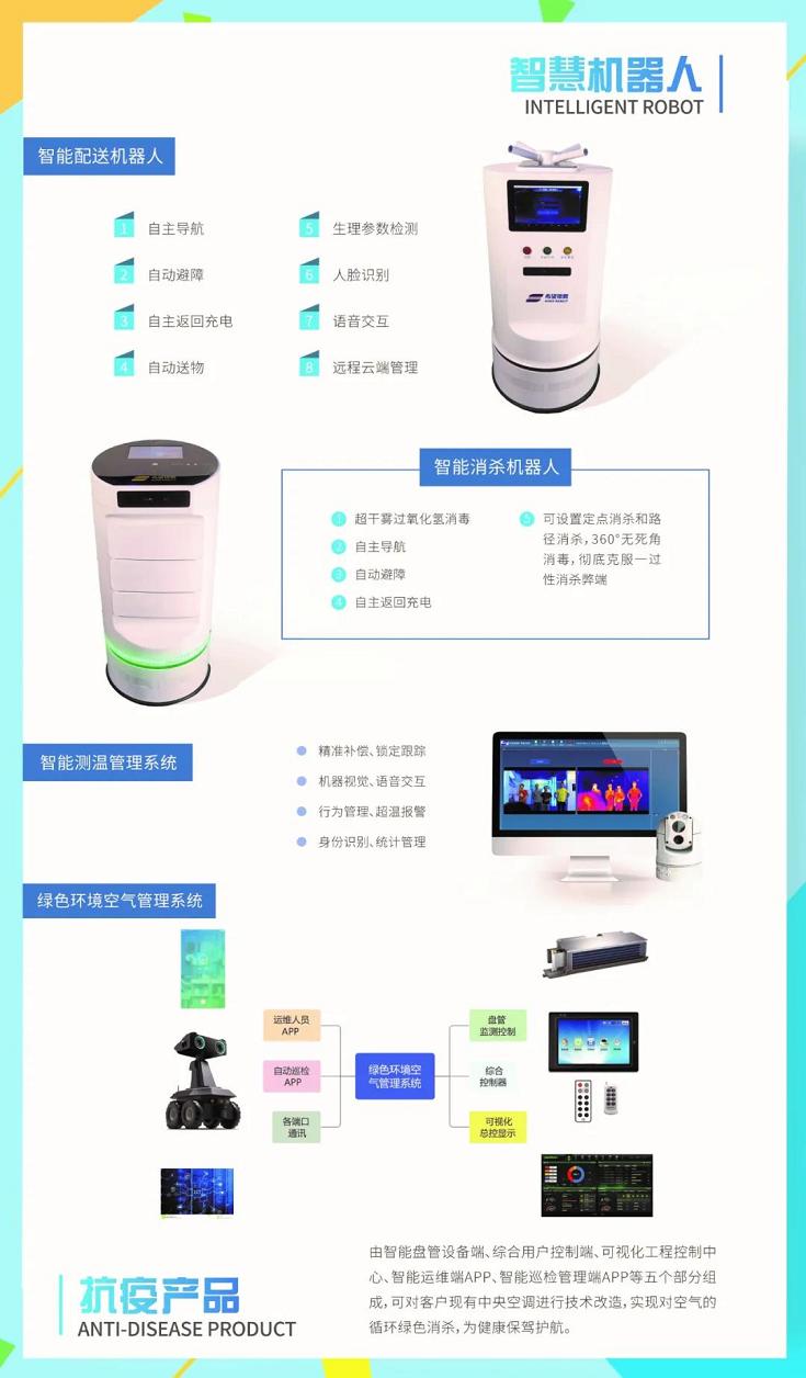 機器人產(chǎn)品是解決方案中最具智能化的高科技產(chǎn)品,憑借集團長(cháng)期的智能制造技術(shù)沉淀,推出智慧測溫機器人、智慧巡檢防疫機器人、智慧配送機器人等系列,還可實(shí)現與空調N95的AI智能聯(lián)動(dòng)。