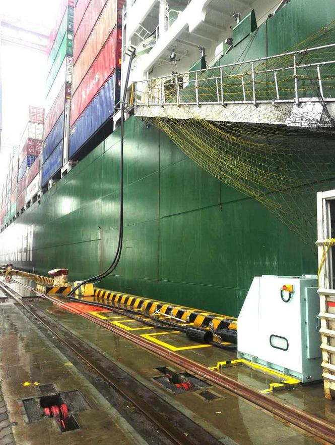 隨后EVER LISSOME LONNON號船上工作人員開(kāi)始放船用連接高壓電纜,岸上工作人員將高壓電纜連接到港口#14泊位區岸電接線(xiàn)箱,EVER LISSOME LONNON具有連接岸電條件。