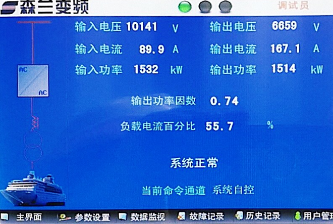 上午11點(diǎn)19分5秒,VFPS系列岸電電源系列正式進(jìn)入并網(wǎng)程序,并網(wǎng)過(guò)程無(wú)沖擊,負荷從船上發(fā)電機系統慢慢向岸上電源系統轉移,并于10S后船上發(fā)電機系統順利解列,正式由VFPS系列岸電電源供電。
